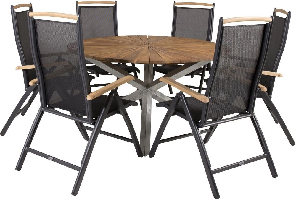 Matgrupp med ett bord och 6 stycken stolar. Stolarna är tillverkade av Aluminium/Textilene/Teak och bordet är tillverkat av Akacia/Stål.
