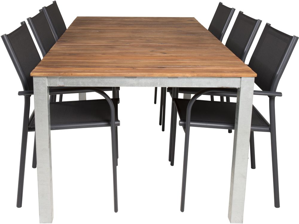 Matgrupp med ett bord och 6 stycken stolar. Stolarna är tillverkade av Aluminium/Textilene och bordet är tillverkat av Akacia/Stål. Stolarna är stapelbara.