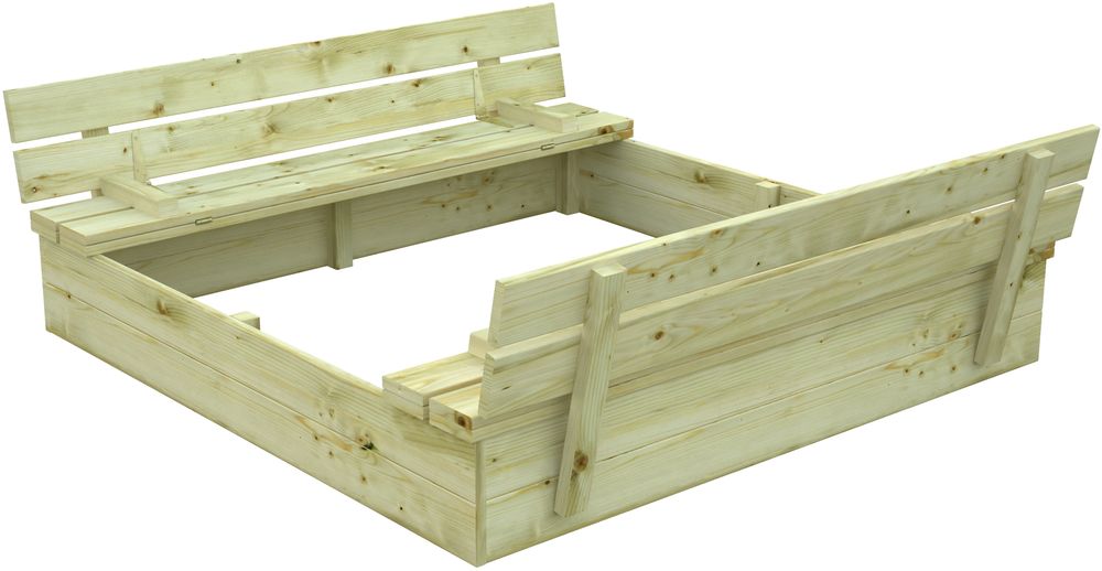 Sandlåda tillverkad av grön djupimpregnerad nordisk gran. Praktiskt lock som kan fällas ut till sittplatser. Finns även underlag för sandlådan att köpa till.