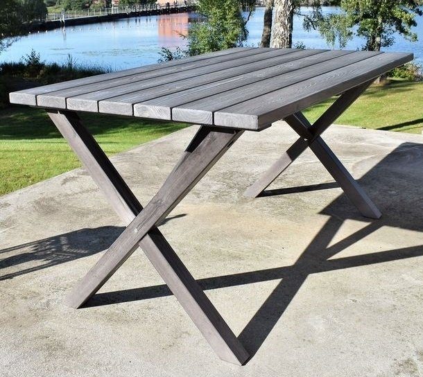Klassiskt bord i furu med en grålaserad yta, kryssben som ger ett elegant och klassiskt utseende. Kombinera gärna med några av våra utestolar för en komplett matgrupp till uteplatsen. Bordet har behandlats för att få den patina man förknippar med Shabby Chic. Eftersom detta arbete sker för hand får varje exemplar ett unikt utseende.