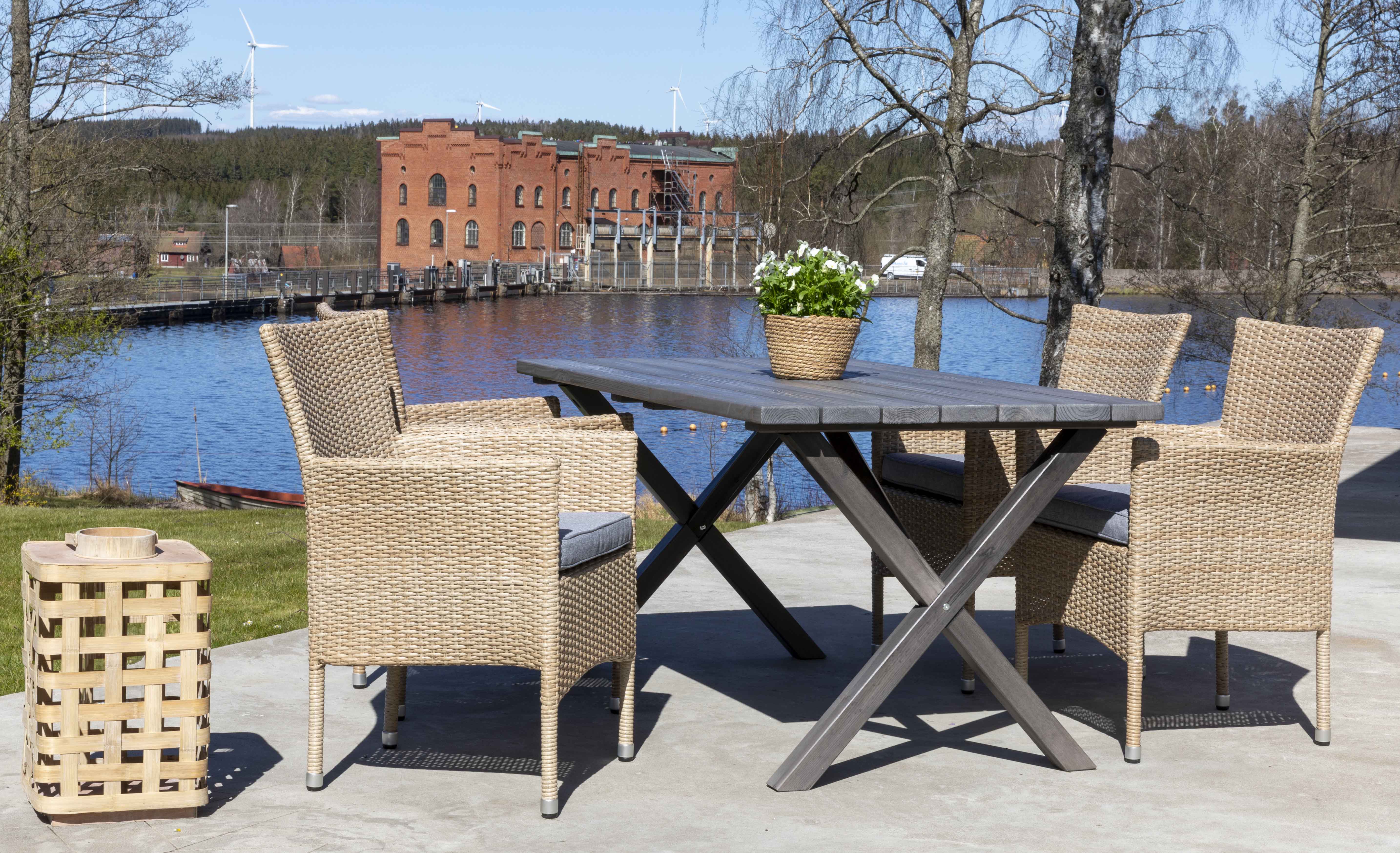 Vancouver matgrupp ger dig en utemöblegrupp i neutral naturfärgad konstrotting som passar in fint i trädgården. Möbelgruppen består av ett rejält matbord med 4 stycken matchande sköna fåtöljer med dynor.
