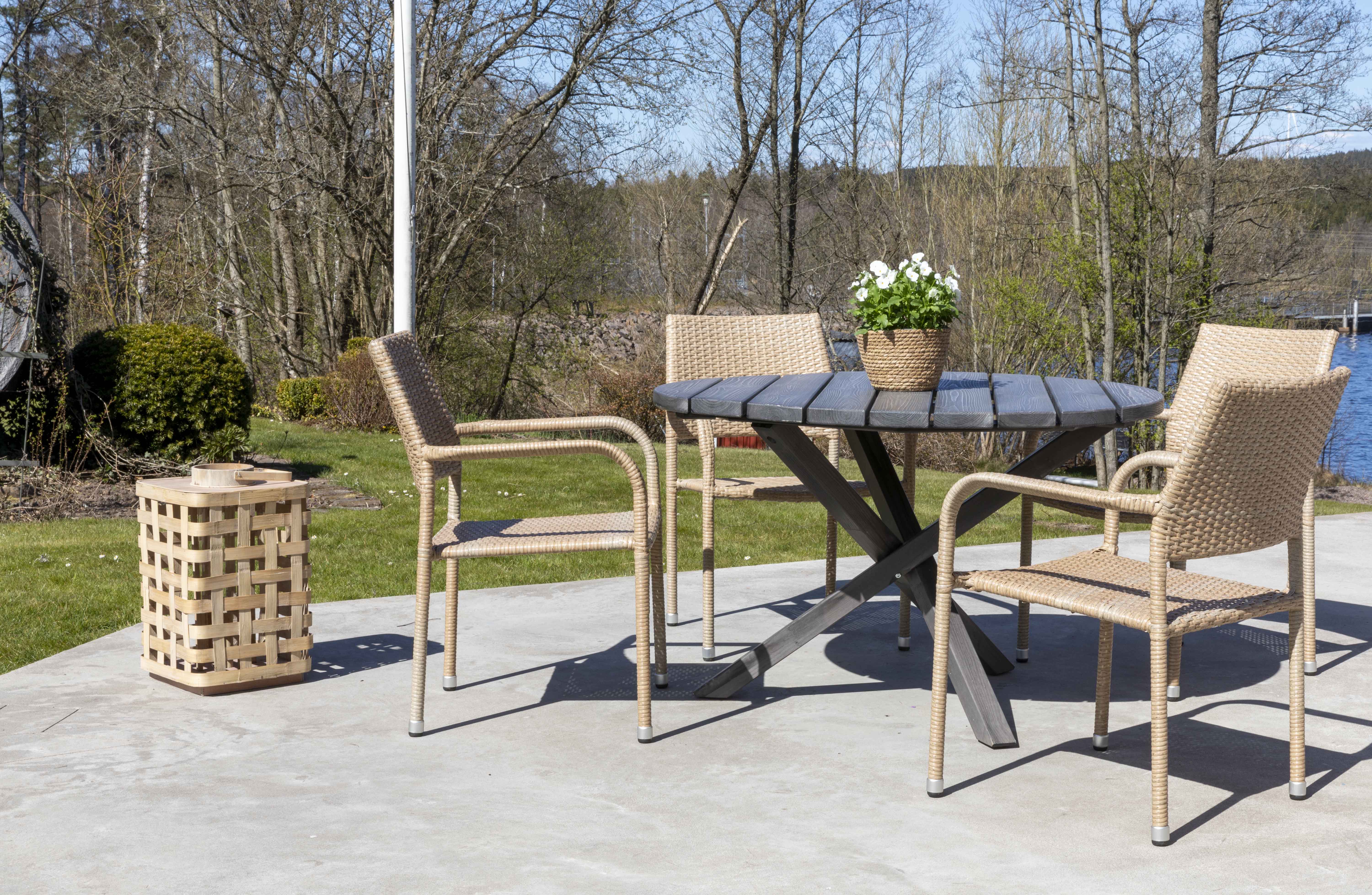 Vancouver matgrupp ger dig en utemöblegrupp i neutral naturfärgad konstrotting som passar in fint i trädgården. Möbelgruppen består av ett runt rejält matbord med 4 stycken matchande stapelbara karmstolar.