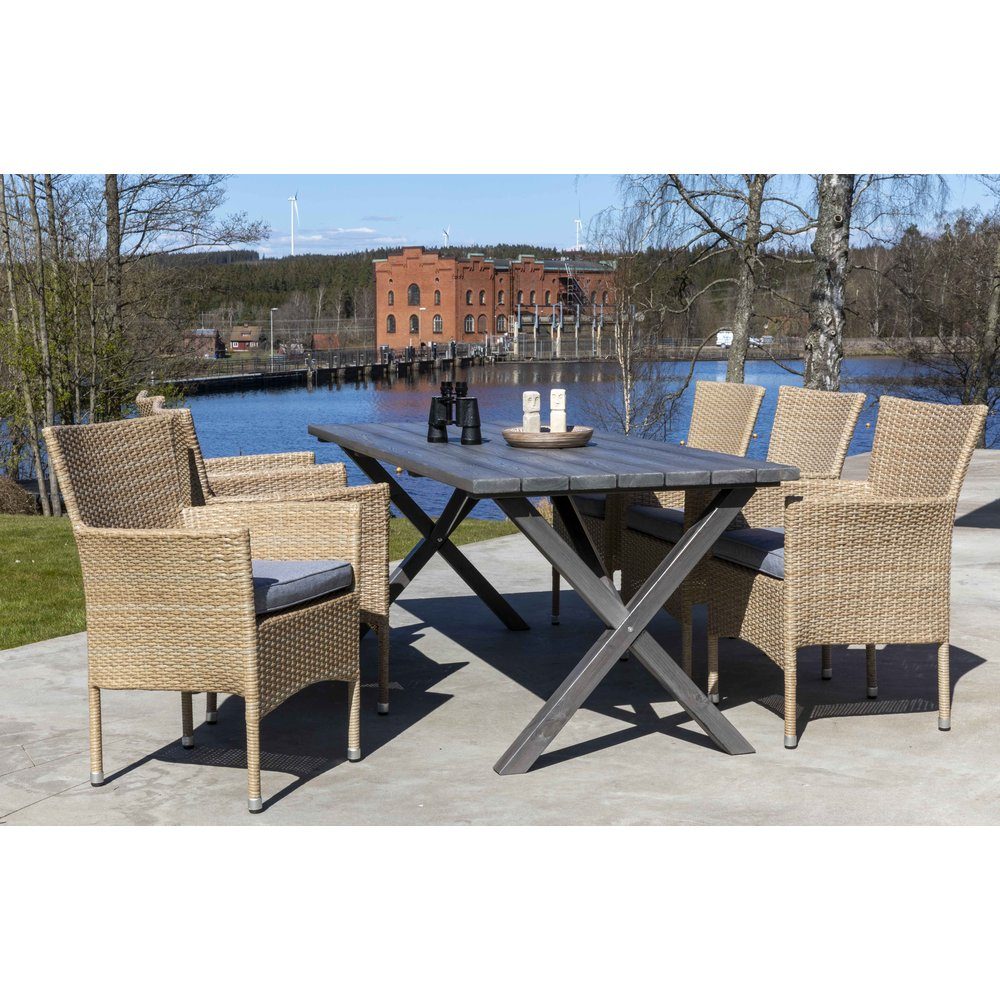 Vancouver matgrupp ger dig en utemöblegrupp i neutral naturfärgad konstrotting som passar in fint i trädgården. Möbelgruppen består av ett rejält matbord med 6 stycken matchande sköna fåtöljer med dynor.