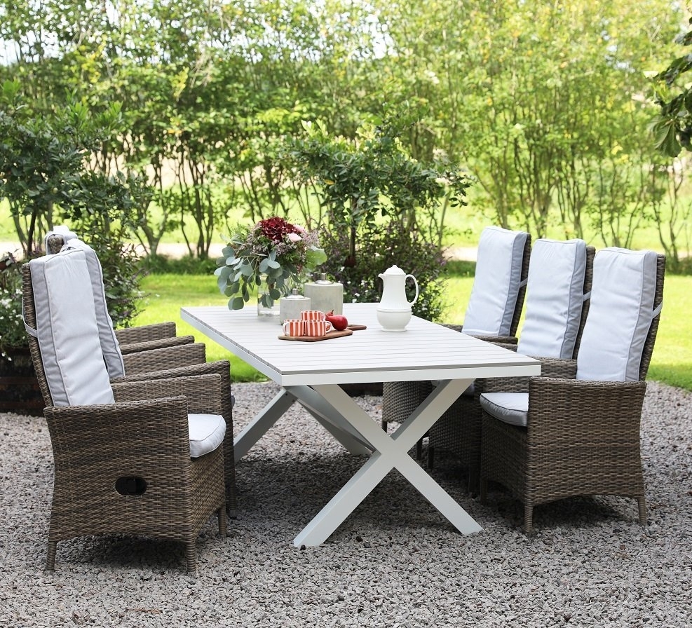 Bordet från Oxford-serien kombinerar hållbarhet och elegans med sin eleganta konstruktion vitlackad alumnium underrede. Bordsskivan består av breda plankor i vädertålig aintwood som skapar ett rustikt och naturligt intryck medan de stabila kryssbenen tillför både stil och stabilitet. Designen på bordet gör det till ett perfekt val för större uteplatser eller terrasser, där det erbjuder en generös och inbjudande yta för middagar med vänner eller familj utomhus.