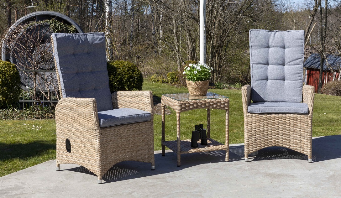 Fåtöljset Sienna highback med två ställbara och ett nätt fyrkantigt sidobord med glastoppskiva och förvaringshylla, allt i matchande naturfärgad konstrotting. Passar bra för avkoppling ute på uteplatsen, terrassen etc. Inklusive ljusgråa dynor. Dubbelvävd halvrund konstrotting.