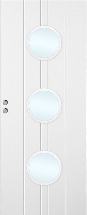 Målad kompakt skjutdörr med spårfräst dekor och glasruta för mycket ljusgenomsläpp.