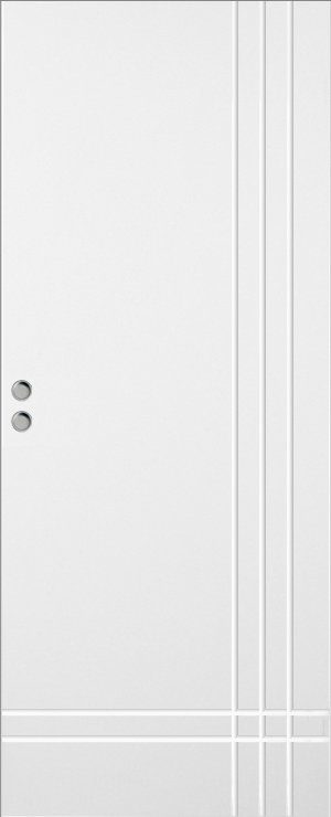 Målad kompakt skjutdörr med spårfräst dekor.