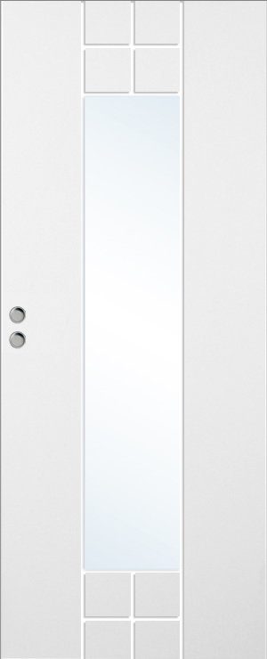 Skjutdörr Bornholm är en målad kompakt skjutdörr med spårfräst dekor och glasruta för mycket ljusgenomsläpp.