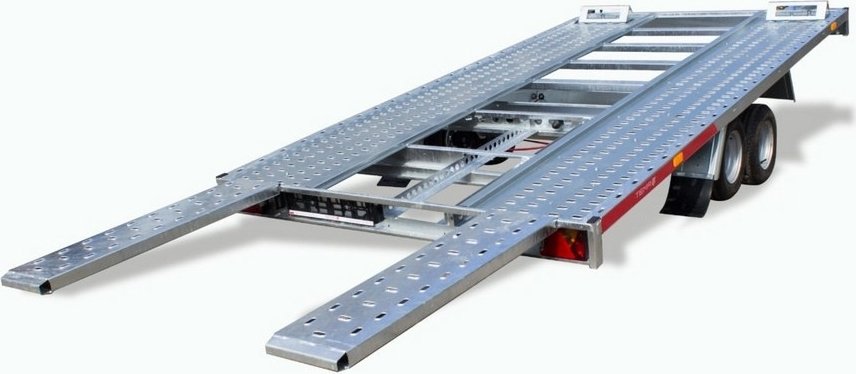 Tiltbart släp med stålramp. Assisterande gascylinder och vinsch som standard.