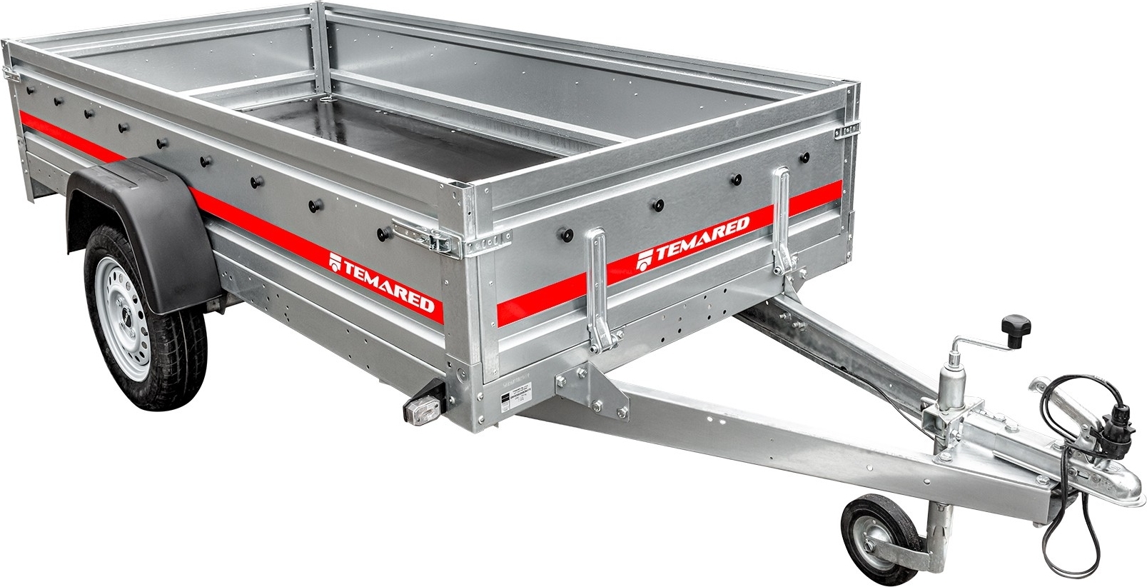 Släp med öppningsbara luckor fram- och baktill, stödhjul framtill och fyra förankringspunkter för lastsäkring. Tillverkad i galvaniserade stålprofiler med 2,5 mm tjocklek, golv i 9 mm formskiva med antihalkyta.