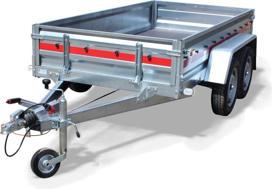 Släp med öppningsbara luckor fram- och baktill, stödhjul framtill och fyra förankringspunkter för lastsäkring. Tillverkad i galvaniserade stålprofiler med 2,5 mm tjocklek.