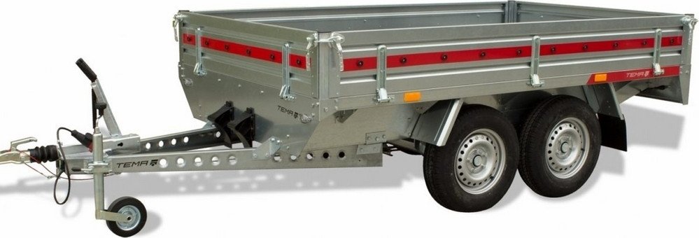 Släpvagn med nedfällbara sidostycken i stål, stödhjul framtill och förankringspunkter för lastsäkring. Tillverkad i galvaniserade stålprofiler, golv i 12 mm formskiva med antihalkyta.