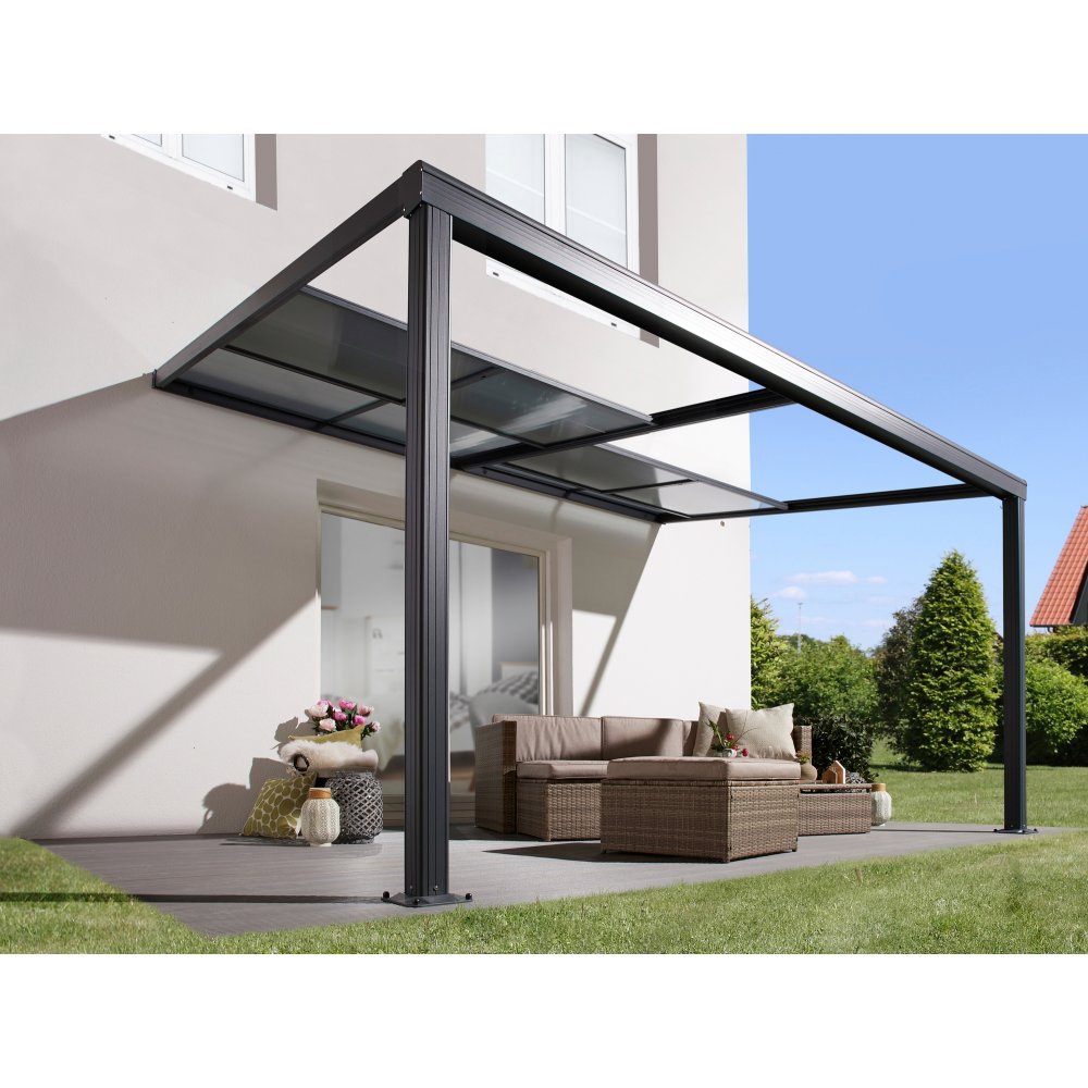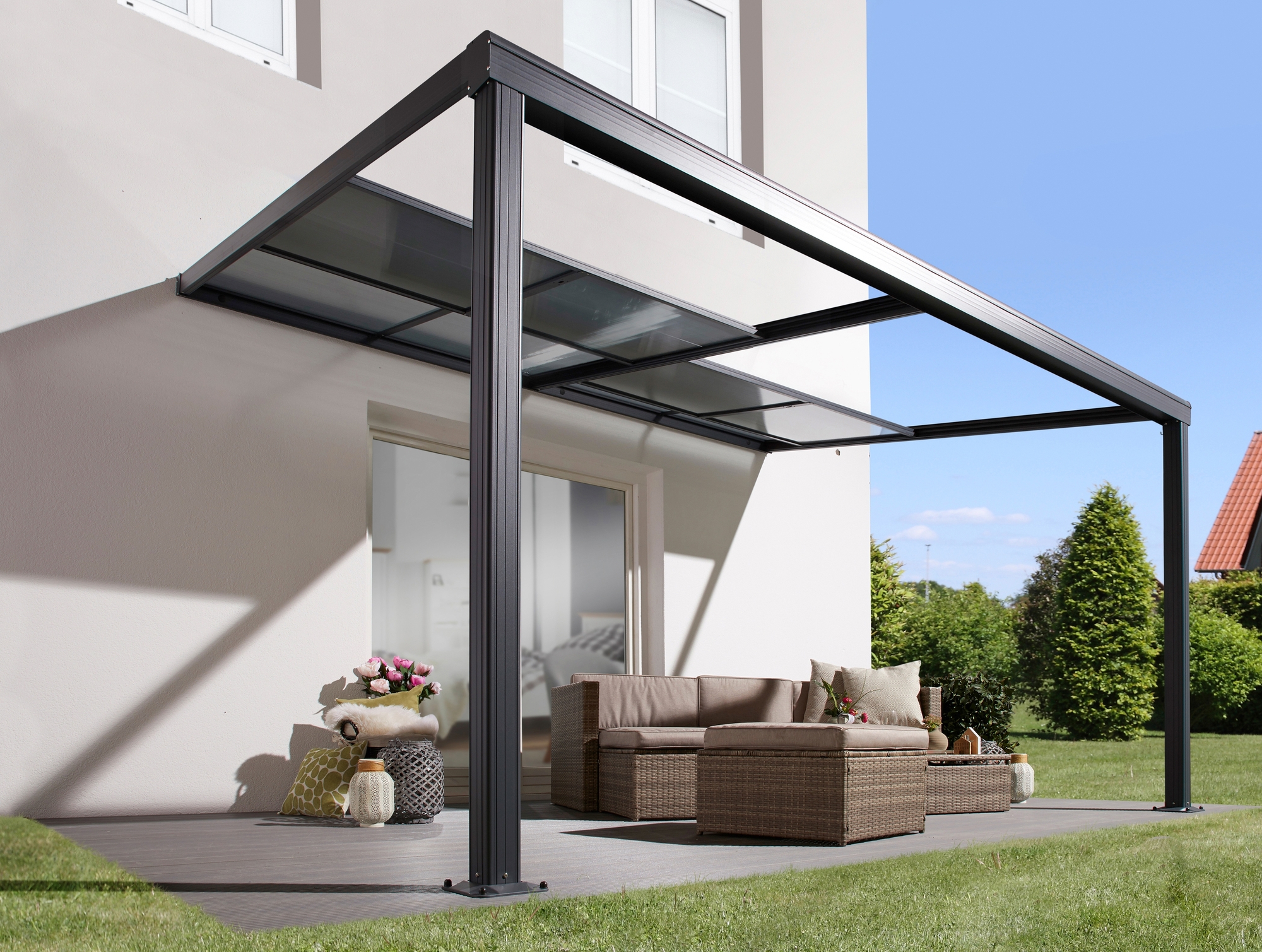 Väggmonterat tak som går att använda till en mysig veranda eller en praktisk carport från väggen. Snygg, praktisk och enkelmonterad uttbyggnadstak gör detta till ett självklart val.