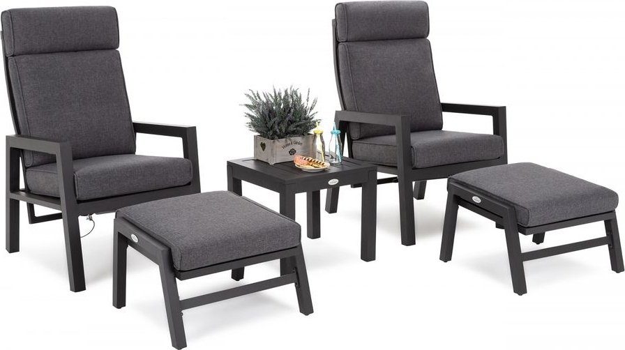 Det mycket tåliga och hållbara materialet aluminum är pulverlackerat och på så sätt ett ypperligt alternativ till dina trädgårdsmöbler. Dessutom är det ett stilrent snyggt material som kontrasterar fint mot de mjuka dynorna i melerad grå. Fåtöljerna är fällbara (35° lutning) med fotpallar och erbjuder skön avkoppling i exempelvis din trädgård, på balkongen eller i uterummet. Ett mindre bord med praktisk avställningsyta och en design som ger vattnet möjlighet att avlägsna.