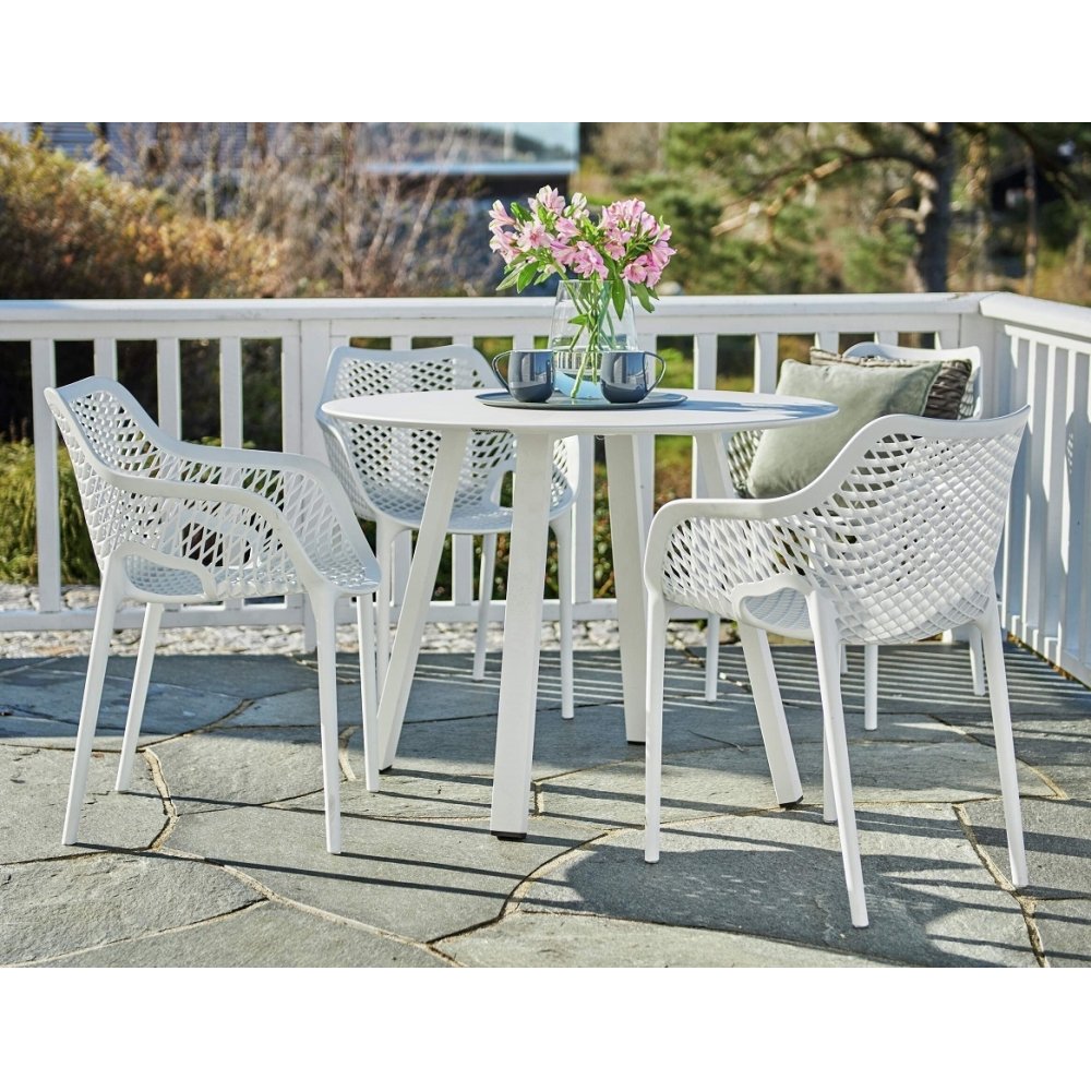 Easy Living By Martinsen, Sommarvik är en enkel och praktisk matgrupp i vitt utförande. Matgruppen består av 4 st stapelbara stolar i vit plast samt ett matchande matbord i vitlackad aluminium.