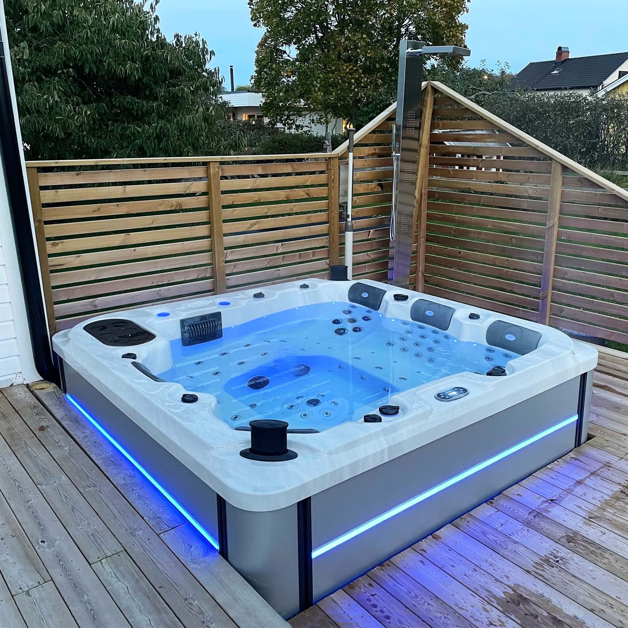 Spabadet har måtten 220x220 cm och är 102 cm högt, vilket ger plats för upp till 6 personer. Vid normal fyllnadsgrad rymmer badet cirka 1100 liter vatten.