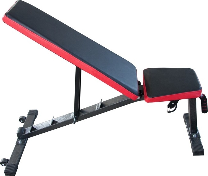 Träningsbänk med ställbart ryggstöd, sits och curlplattform. Bänken är utrustad med hjul och handtag för enkel förflyttning.
