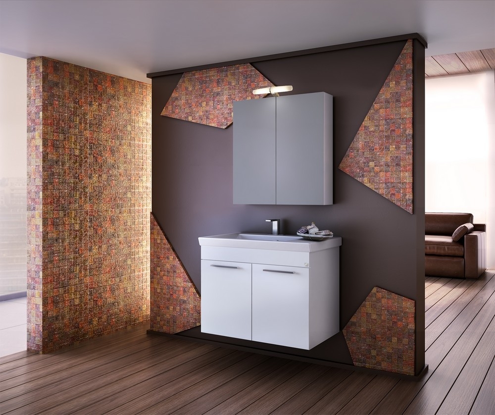 Spegelskåpet har två sidohängda luckor och en fin lampa i form av belysningspaketet Eva, som ger dig bra belysning vid behov.