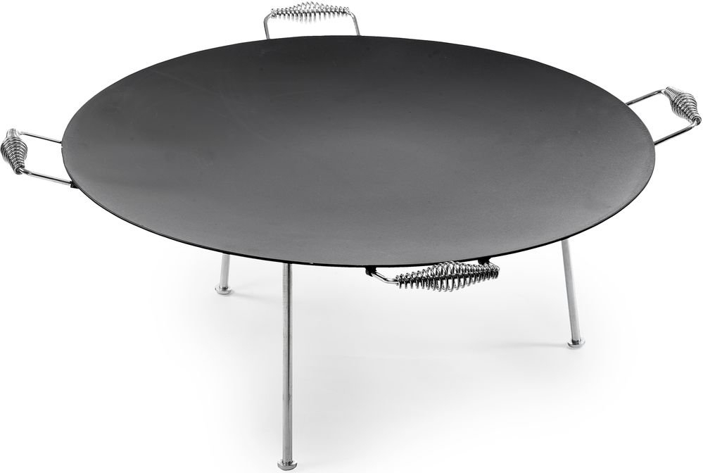 Stekhäll tillverkad i 4 mm varmvalsad stål. 3 st avtagbara ben ingår. Handtag på fyra sidor av stekhällen för lätt förflyttning.