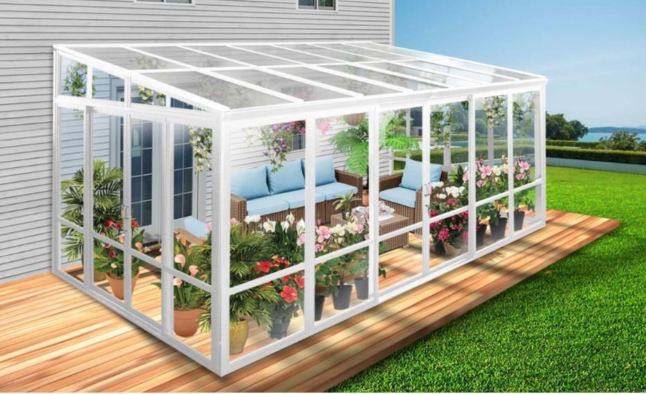Det pulverlackerade aluminiumet är mycket motståndskraftigt mot korrosion (bl a rost), och tillsammans med den 8mm tjocka polykarbonatpanelen blir uterummet både stadigt och hållbart.