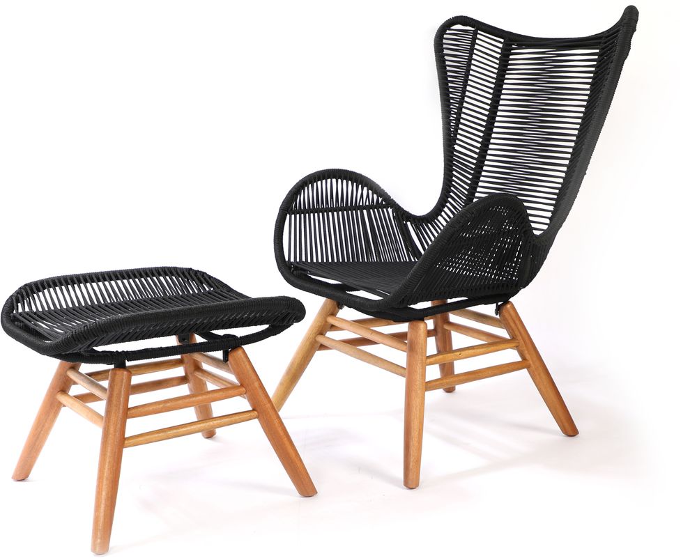 Fåtölj med fotpall tillverkade av akacia och svart rep.