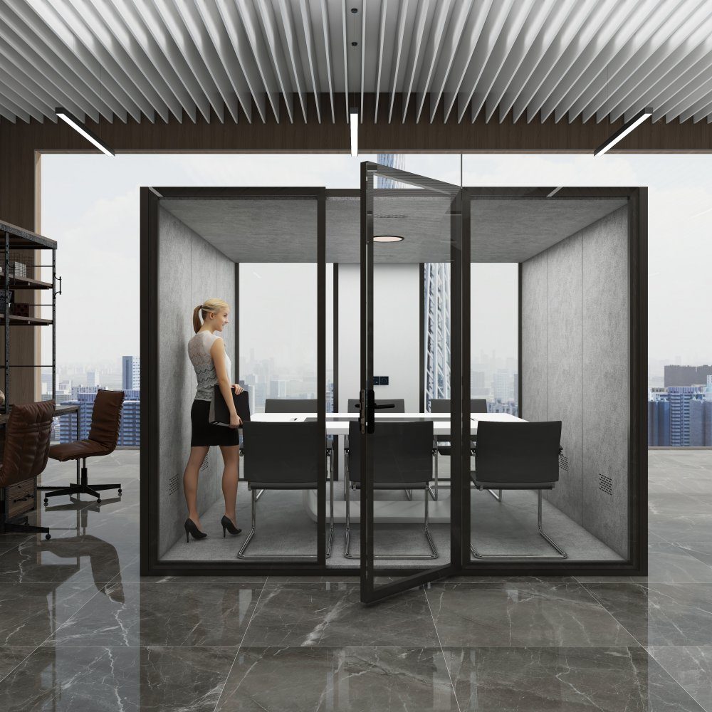 - Mått: 3000 x 3000 x 2300 mm – perfekt för små möten eller fokuserat arbete
