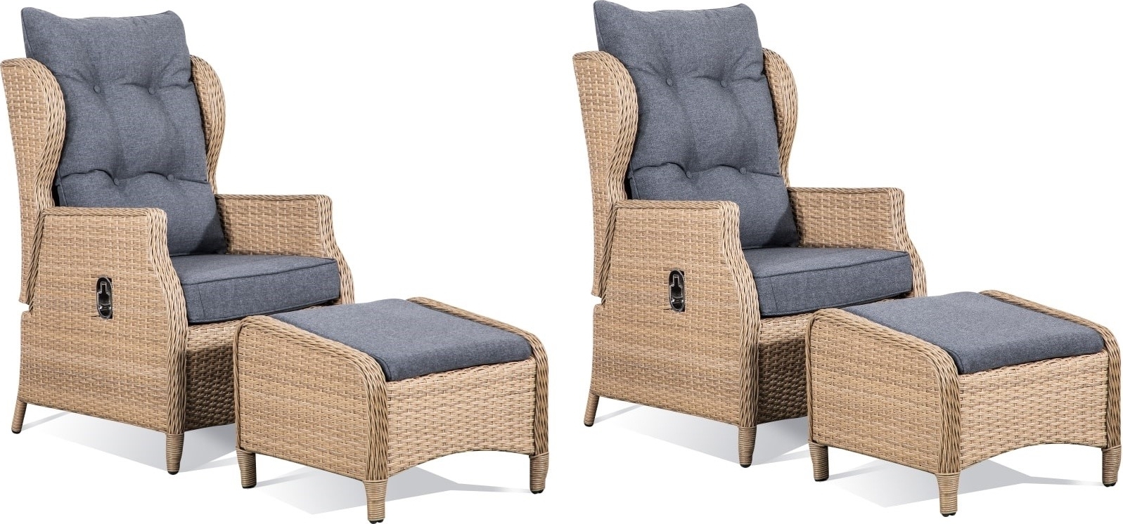 Toledo utemöbel set med fällbara fåtöljer i naturfärgad dubbelvävd halvrund konstrotting med tillhörande fotpall. Ljusgrå tjocka dynor för god komfort. Bra fåtöljer som gör sig bra på de flesta uteplatser.