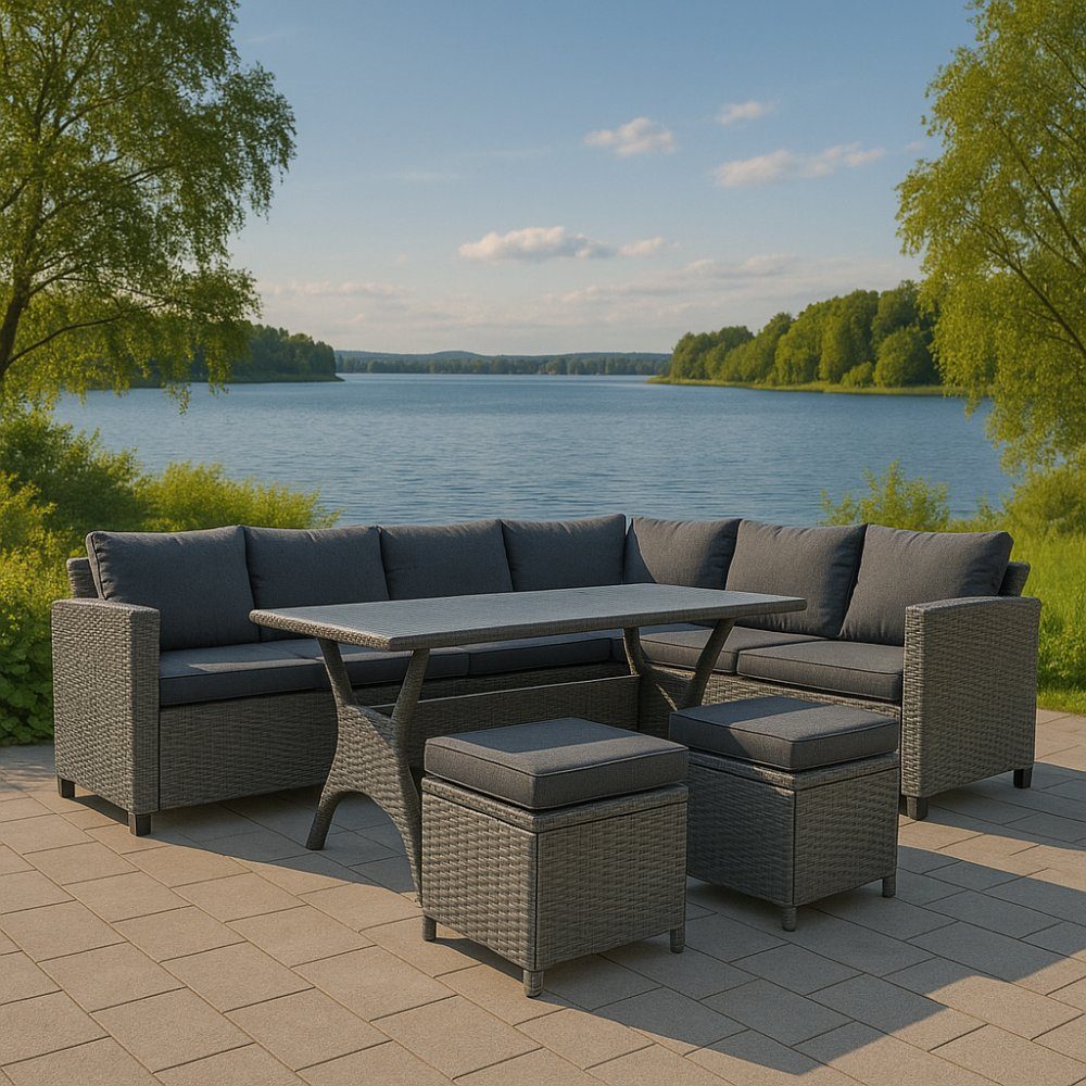 Tor soffgrupp erbjuder totalt åtta sittplatser, fördelade mellan hörnsoffan och de två pallar som ingår. Bordets höjd gör det möjligt att använda gruppen både för avkoppling och för att äta, vilket gör den flexibel och anpassningsbar efter behov. Den robusta konstruktionen gör att möblerna passar lika bra för vardagligt bruk som för större sammankomster.