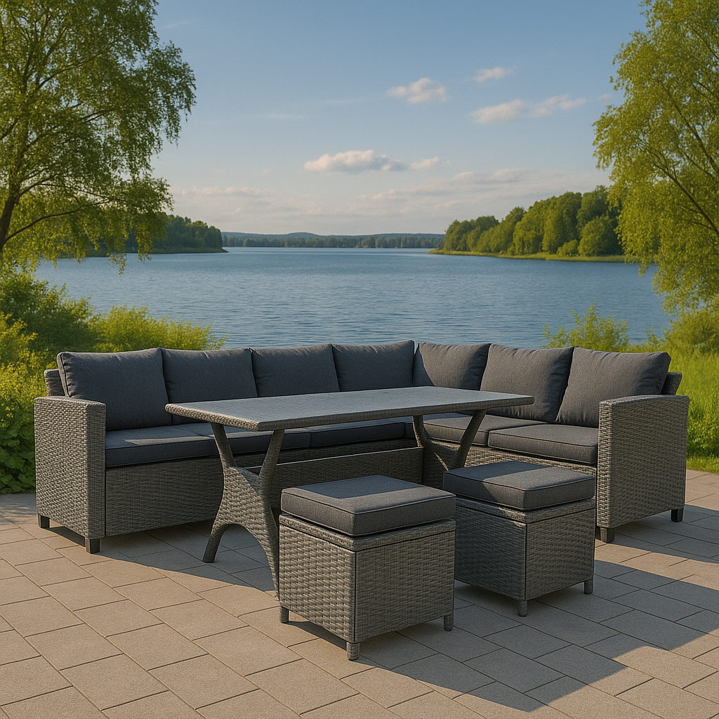 Tor utesoffgrupp är utformad för att ge gott om plats och hög funktionalitet på uteplatsen. Gruppen består av en rejäl hörnsoffa med plats för flera personer, ett högt och stabilt bord samt två praktiska pallar som kan användas både som extra sittplatser eller fotstöd. Tack vare den generösa storleken passar Tor utmärkt för större familjer eller sociala tillfällen där många samlas. Dynorna som ingår är anpassade för utomhusbruk och ger god komfort vid både avslappning och måltider.