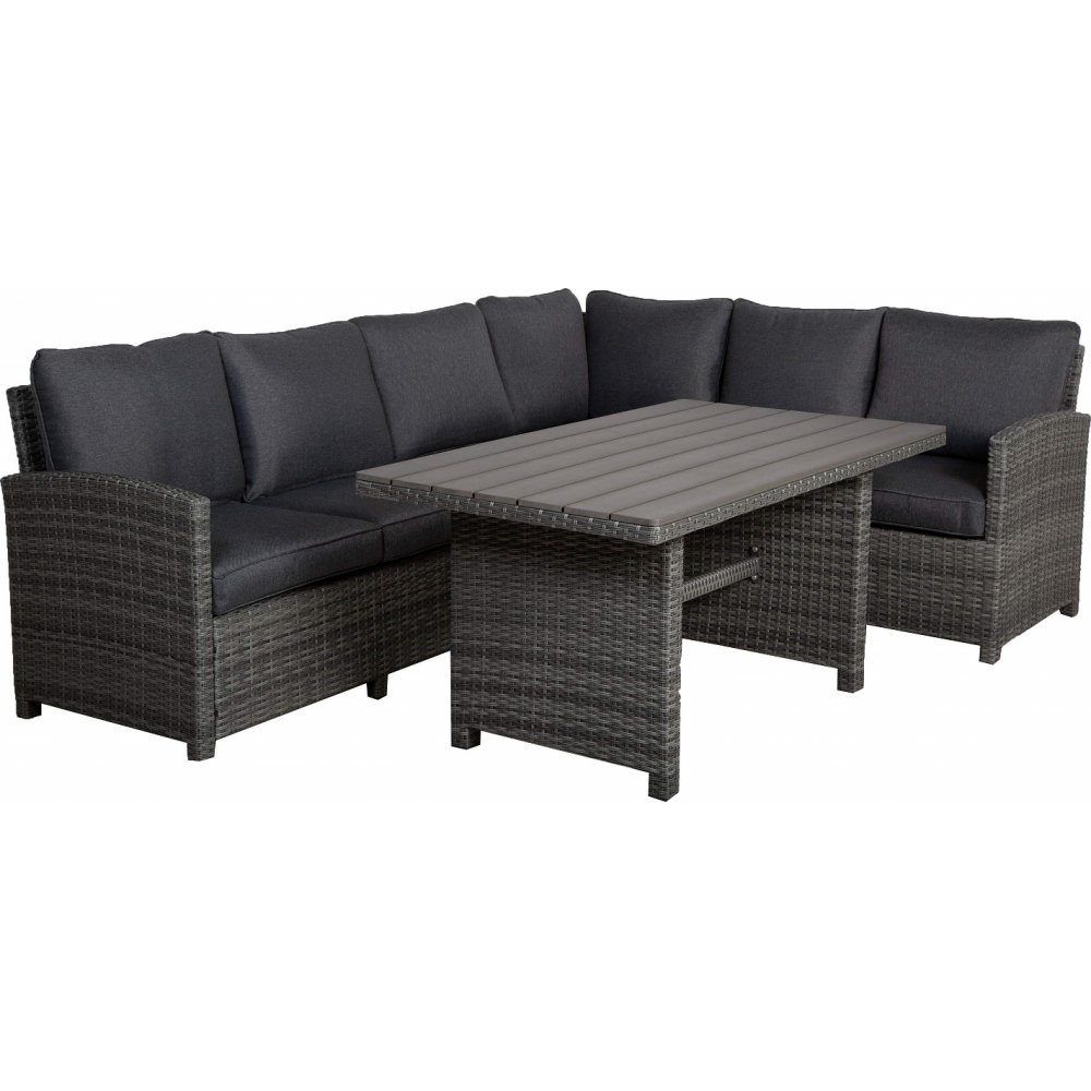 Easy Living By Martinsen, Torekov är en klassisk högkvalitativ loungegrupp med stomme i aluminium, dubbel halvrund konstrotting och 10 cm höga sittdynor som är klädda i vävd polyester. Bordet har en topp av grå polywood som är väderbeständig och tål att stå ute året runt. Den stora hörnsoffan och matbordet ger ett komplett paket för att få till en trevlig plats på altanen för hela familjen.