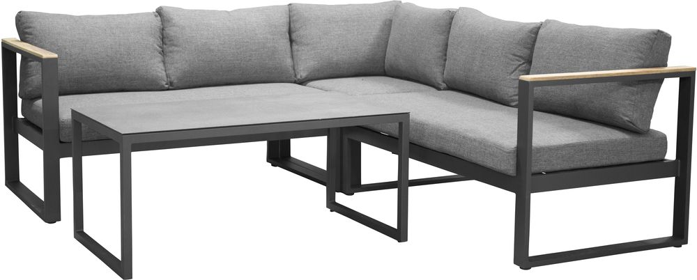 Soffgrupp med en hörnsoffa och ett bord. Underrede & stomme tillverkat av svart metall. Bordsskiva av glas.