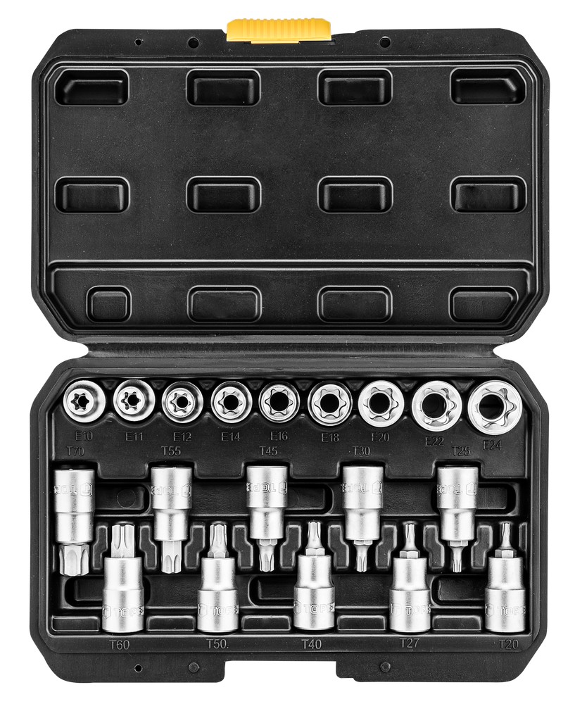 Sats om 9 torxhylsor och 10 torxbitshylsor, sorterat i en praktiskt låda. Tillverkat i tåligt CrV-stål.