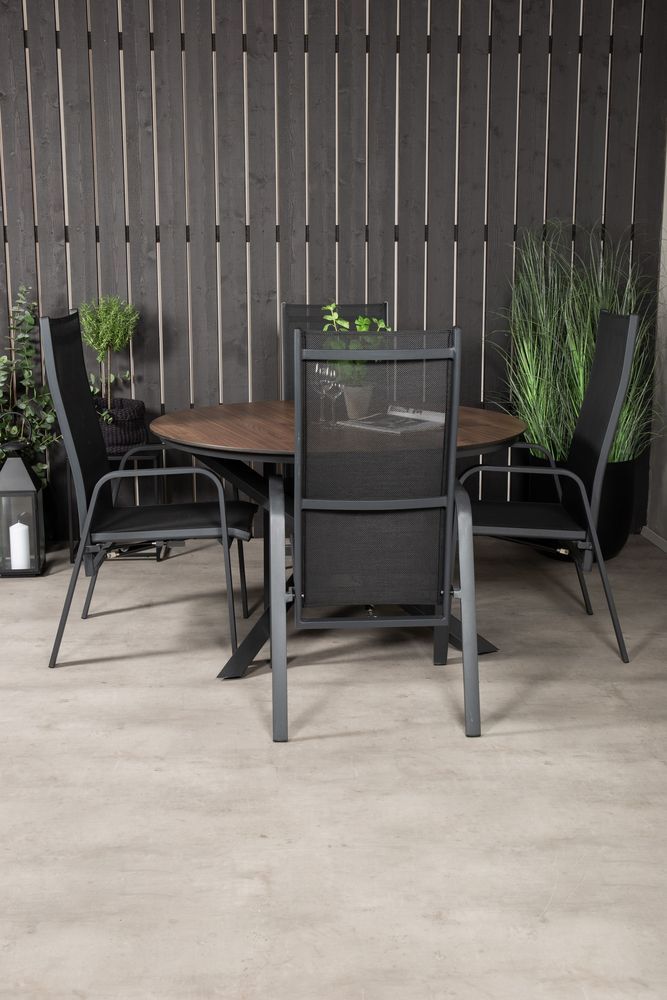 Matgrupp med ett bord och 4 stycken stolar. Stolarna är tillverkade av Aluminium/Textilene och bordet är tillverkat av Laminat/Aluminium. Stolarna är stapelbara.