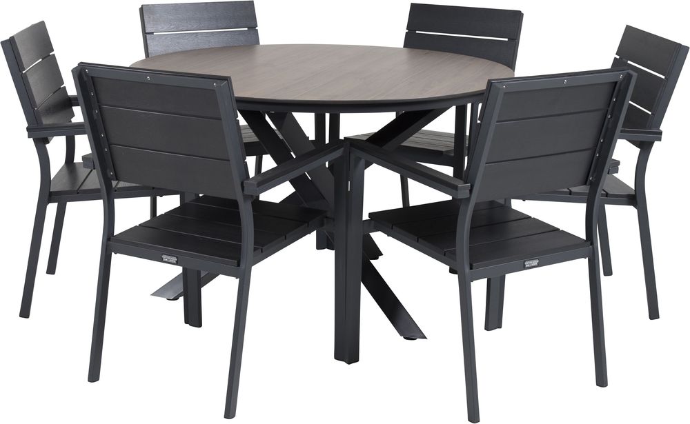 Matgrupp med ett bord och 6 stycken stolar. Stolarna är tillverkade av Aluminium/Polywood och bordet är tillverkat av Laminat/Aluminium. Stolarna är stapelbara.
