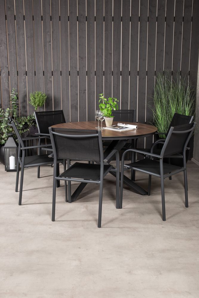 Matgrupp med ett bord och 6 stycken stolar. Stolarna är tillverkade av Aluminium/Textilene och bordet är tillverkat av Laminat/Aluminium. Stolarna är stapelbara.