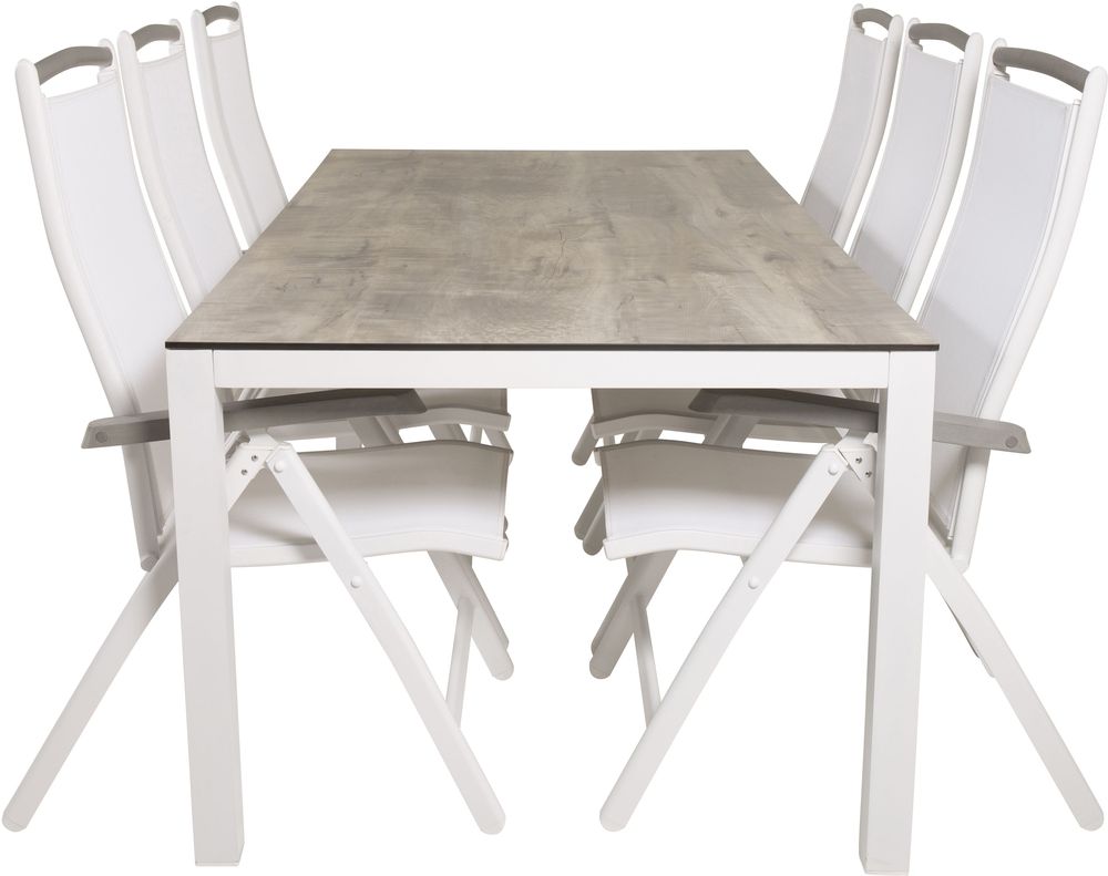 Matgrupp med ett bord och 6 stycken stolar. Stolarna är tillverkade av Aluminium/Aintwood/Textilene och bordet är tillverkat av Laminat/Aluminium.