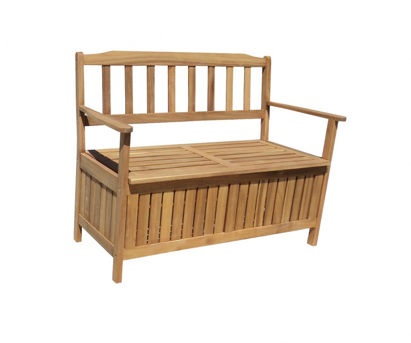 Träbänk med förvaringsutrymme. Lämplig i uterum eller på inglasad altan.
