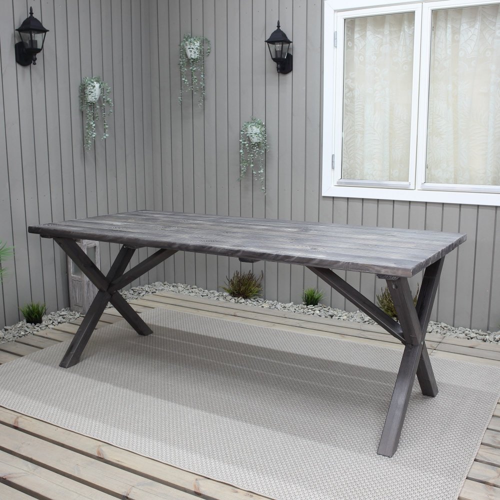 Bordet Scottsdale imponerar med sin robusta konstruktion och sitt rustika uttryck. Tillverkat i massivt trä och behandlat för hand för att få en patinerad, väderbiten look, ger det en varm och inbjudande känsla till uteplatsen. Varje bord har sitt eget unika utseende med naturliga variationer i träets struktur och färg, vilket bidrar till dess personliga charm. Kryssbenen förstärker den rustika känslan och ger stabilitet för alla tillfällen – från vardagsmiddagar till sommarfester.