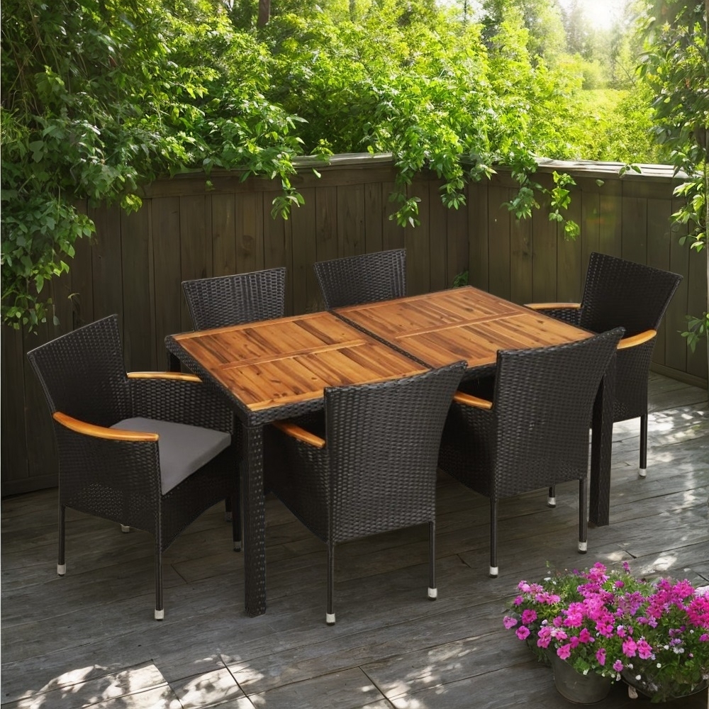 Matbordet kombinerar exklusiv känsla med hållbarhet tack vare sin vackra bordsskiva i äkta akacia. Stommen i metall är behandlad för att klara utomhusklimatet utan att rosta. Stolarna är tillverkade i 8 mm svart väderbeständig rotting och erbjuder hög komfort, kompletterade med sittdynor som ingår i setet.