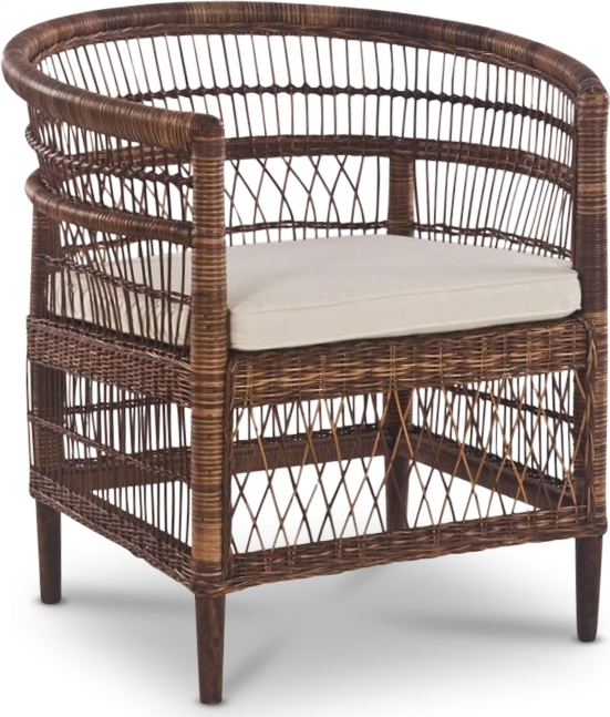 Fåtölj i brun rotting med duna i ljust tyg. Tål inte att ha ståendes utomhus utan behöver vara under tak.