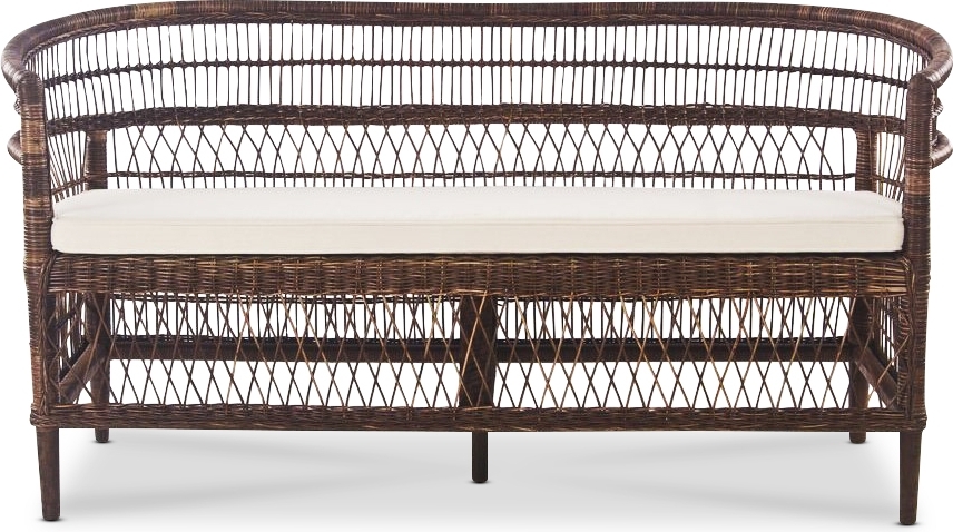 Soffa i brun rotting med dyna i ljust tyg. Tål inte att ha ståendes utomhus utan behöver vara under tak.