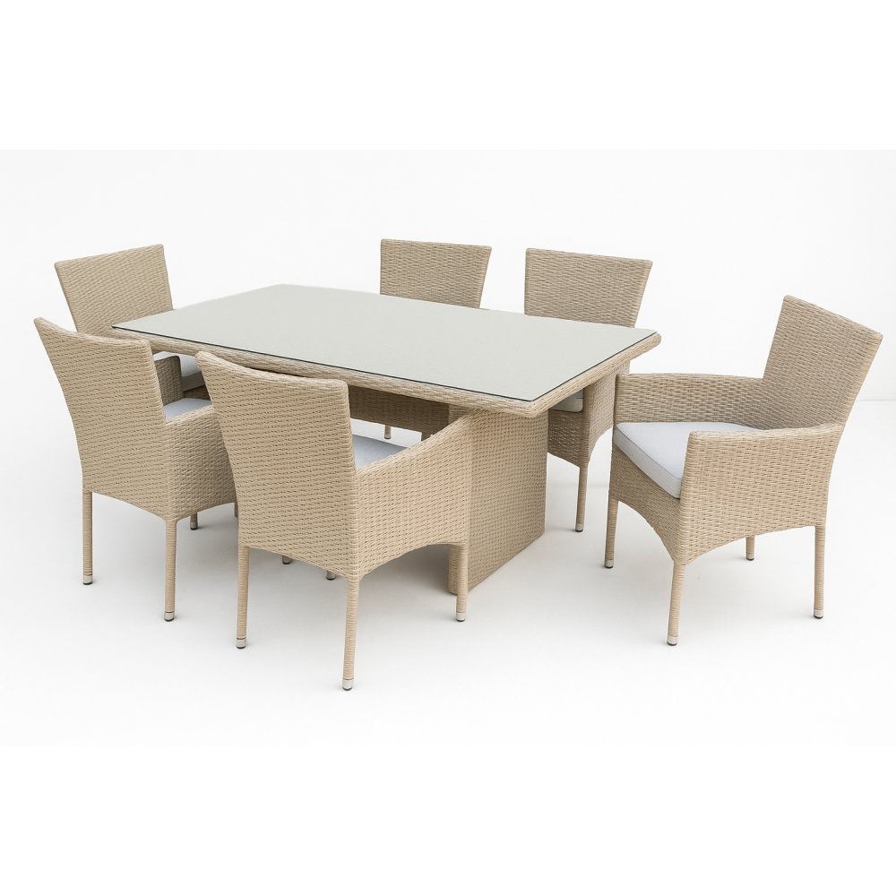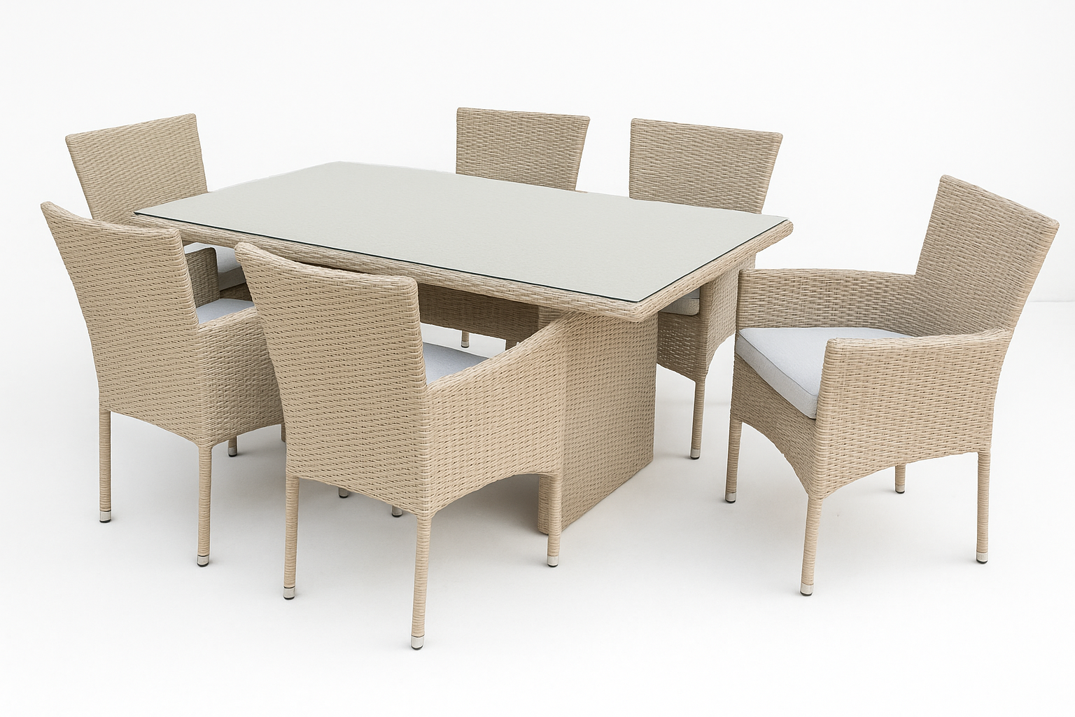 Hampton-bordet bjuder på både rejäl yta och tidlös stil, med en slitstark glasskiva som ger bordet en elegant finish. Menton-fåtöljerna är klädda i mjuk konstrotting och levereras med 5 cm tjocka dynor i beige – perfekt för långa middagar i goda vänners lag. De rundade formerna och den generösa sitthöjden gör stolarna både bekväma och inbjudande.