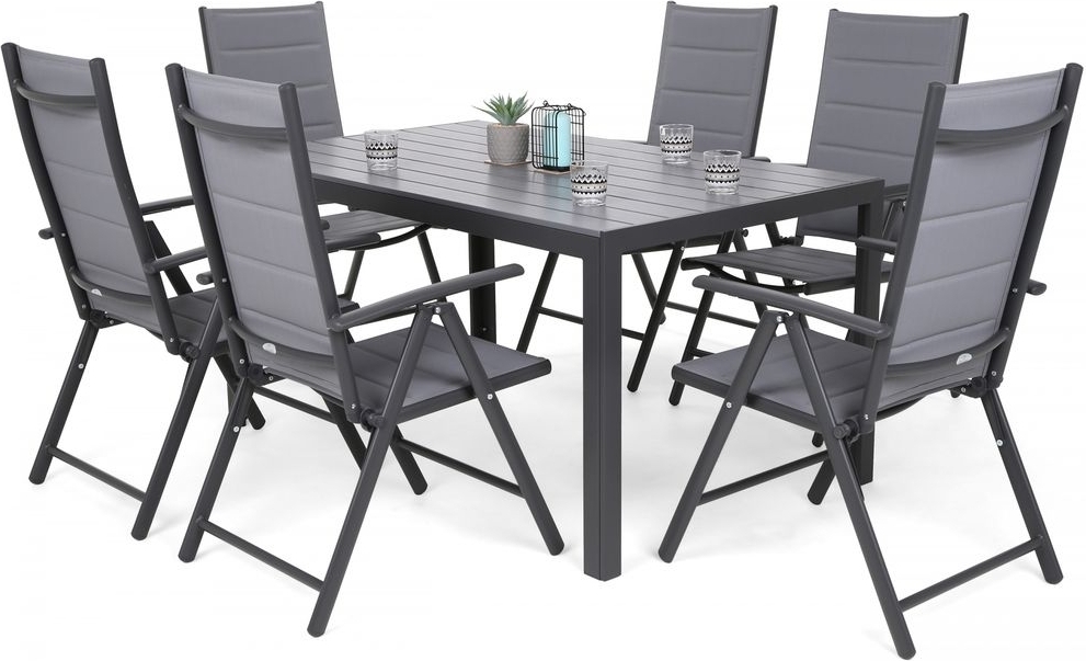 Modern matgrupp med bord och 6 st stolar tillverkade i pulverlackerad aluminium. Stolarna är klädda med stoppad textil. Stolarna går det även att ställa in ryggstödet i 7 olika positioner, samt fälla ihop för att spara på plats. Bordsskivan är tillverkad av WPC komposit.