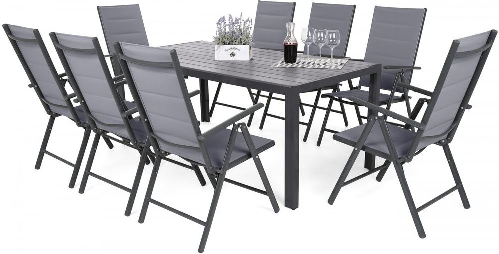 Modern matgrupp med bord och 8 st stolar tillverkade i pulverlackerad aluminium. Stolarna är klädda med stoppad textil. Stolarna går det även att ställa in ryggstödet i 7 olika positioner, samt fälla ihop för att spara på plats. Bordsskivan är tillverkad av WPC komposit.