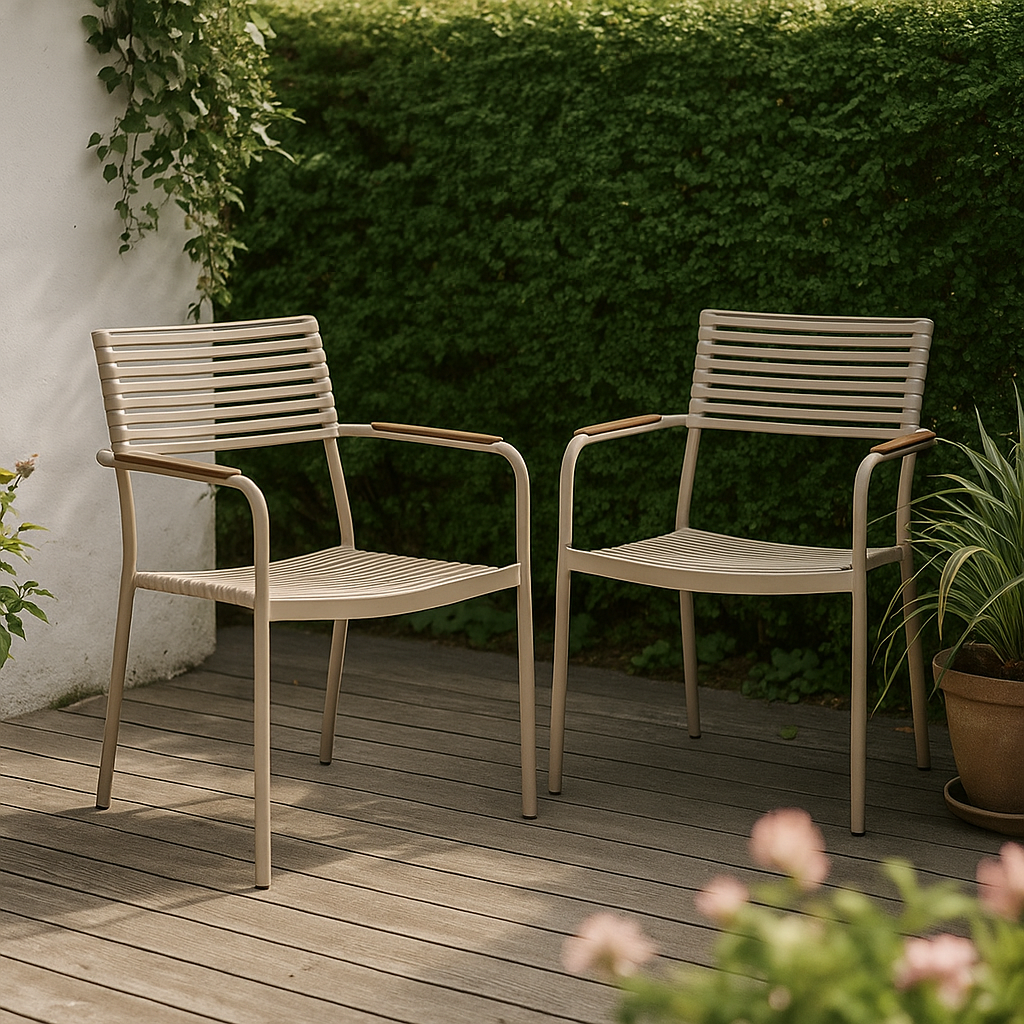 Teak är ett naturligt oljerikt träslag som står emot väder och vind – perfekt för utomhusbruk. Saltö-bordet kommer från hållbart odlade teakskogar godkända av den indonesiska skogsstyrelsen. Pino-stolarna är tillverkade i slitstark metall och plast, vilket gör dem både stabila och underhållsfria. Regelbunden rengöring är allt som krävs för att möblerna ska hålla sig fina år efter år.