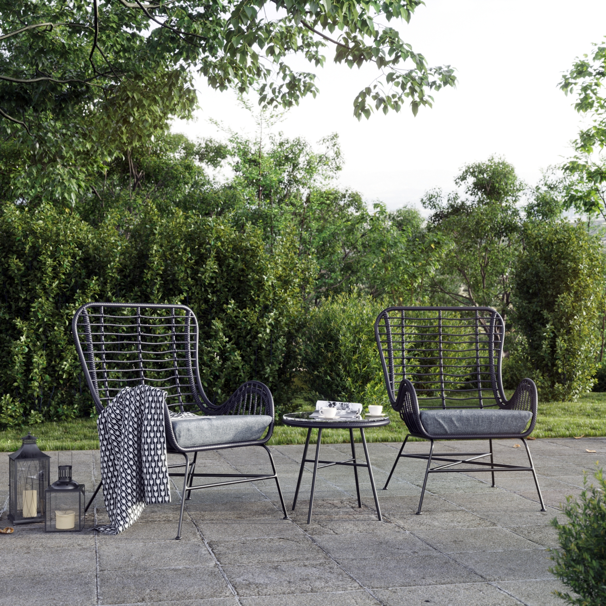 Trevlig liten utemöbelgrupp gjord av mörk konstrotting som passar enkelt in bland andra möbelstilar. Möbelgruppen består av två rottingstolar och ett bord med 5mm glasskiva.