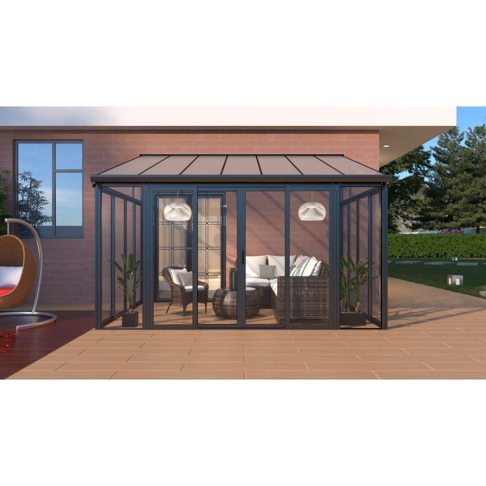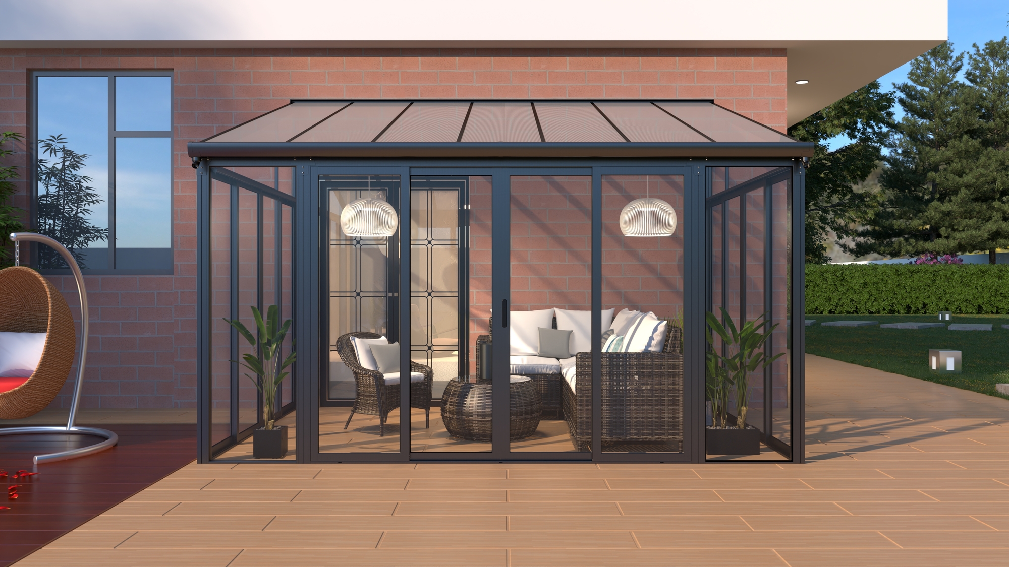 Detta uterum är utformat med en modern och renlinjig design som förstorar ditt hem och ger en säker och ultratålig miljö som kan njutas av året runt. Den genomskinliga väggkonstruktionen ger en känsla av öppenhet och ljus samtidigt som den är enkel att rengöra. För enkel åtkomst finns tre förmonterade dörrar med låsbara skjutdörrar. Stupränn-systemet är integrerat med justerbara gavlar för effektivt regnvattenhantering.