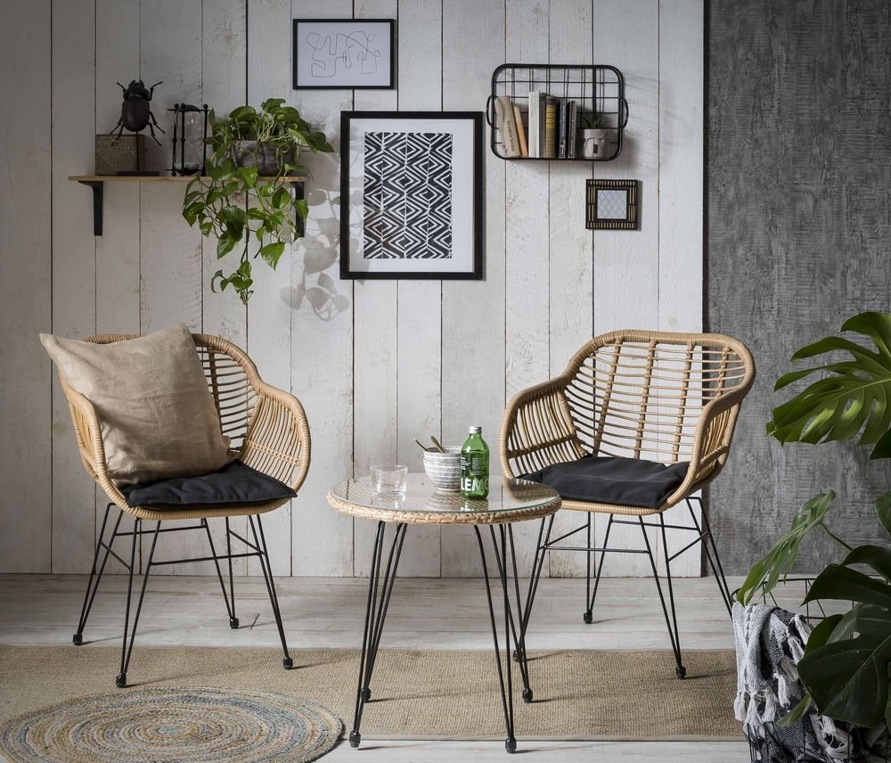 Utemöbelgrupp i naturfärgad konstrotting med svarta ben av metall. Set bestående av 2 fåtöljer samt ett bord. Toppskiva på bord av glas.