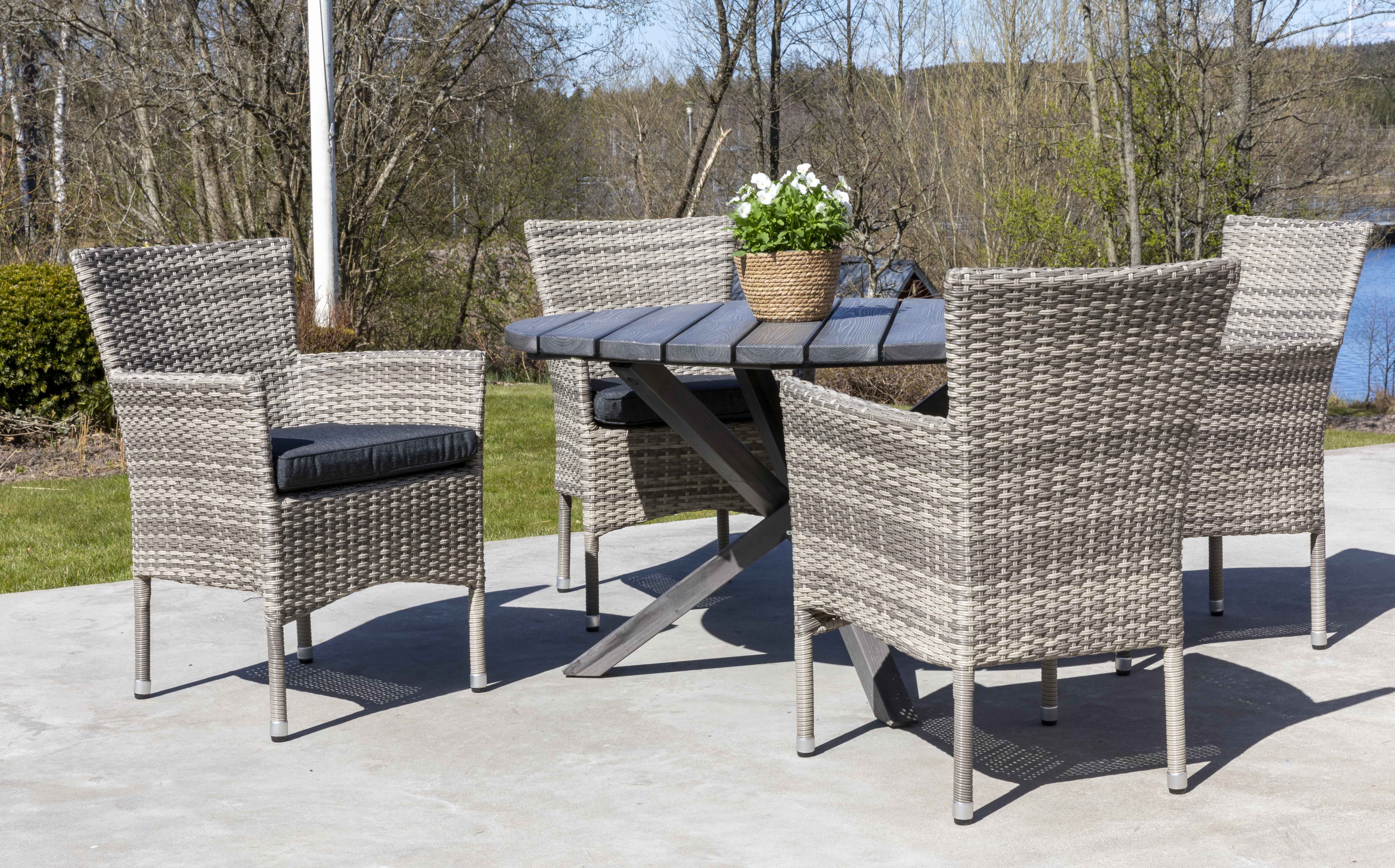 Vancouver matgrupp ger dig en utemöblegrupp i neutral gråmelerad konstrotting som passar in fint i trädgården. Möbelgruppen består av ett runt rejält matbord med 4 stycken matchande sköna fåtöljer med dynor.