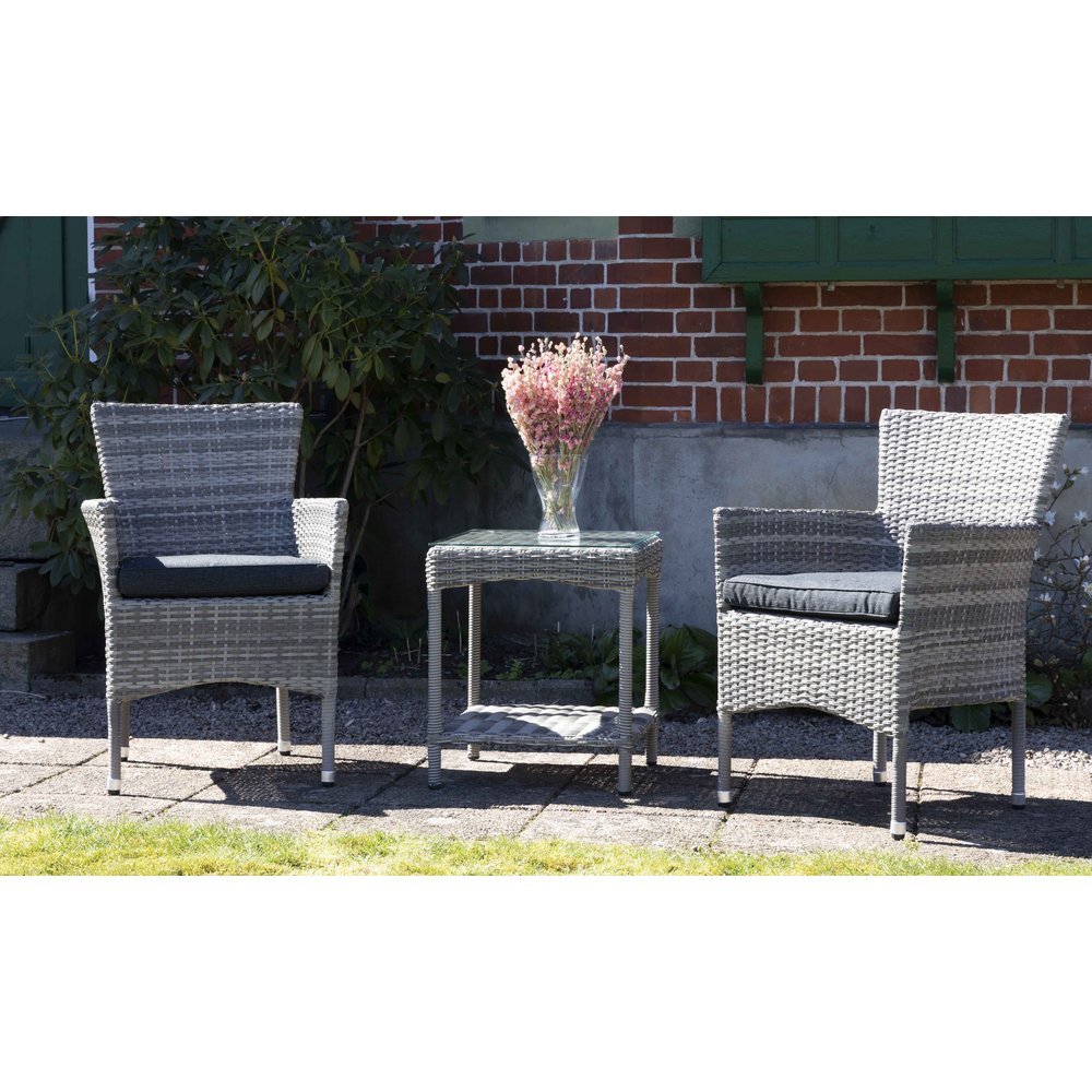 Fåtöljset Vancouver med två sköna fåtöljer med dynor och ett sidobord, allt i matchande gråmelerad konstrotting. Passar bra för avkoppling ute på balkongen, terrassen etc.